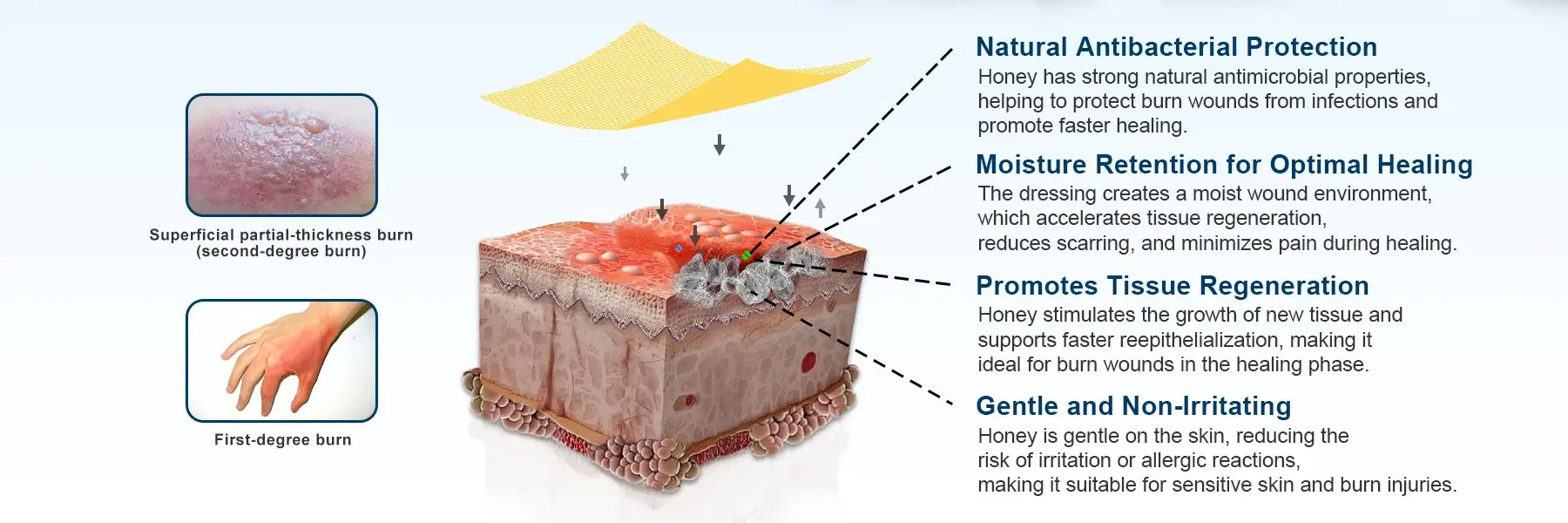 - Protective Action: The thin layer of honey formed by the dressing protects the wound from external irritation, helping prevent further damage and infection.